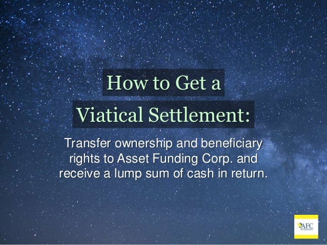 Terminally ill individual in exchange for being named the beneficiary of his life insurance policy. The policyholder benefits by converting an UNUSUAL INVESTMENTS: A LOOK AT VIATICAL SETTLEMENTS. 18 AAII Journal/July 1998 FEATURE the viatical settlement. Determining the life expectancy of ... Retrieve Doc